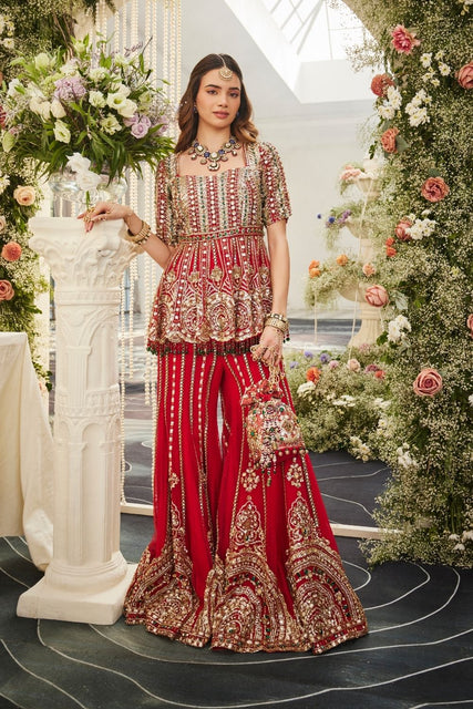 NEWBESTSELLER CELEBRITIES CELEBRITY SPOTTED IN SWISH New NEW ARRIVALS peplum sharara set scarlet & emerald Scarlet And Emerald SHARARA SHARARA SETDeeksha Khurana in Crimson Halo- Regular price