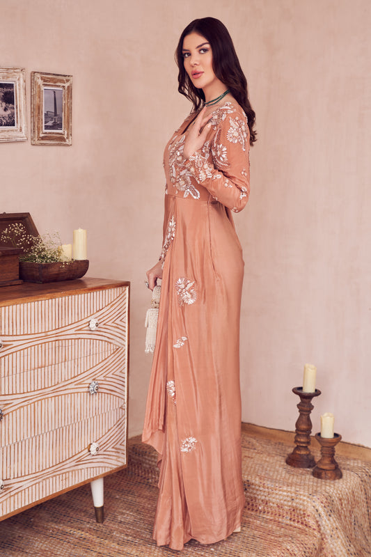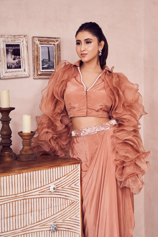 Gilded rose gold lining shantoon embellished pre-draped saree with jacket