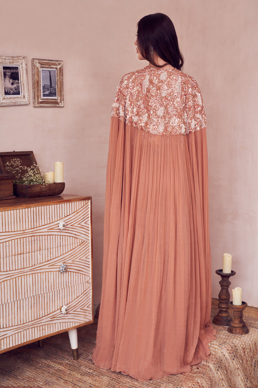 Evening skies rose gold georgette embellished pearl sweetheart gown with cape