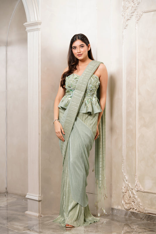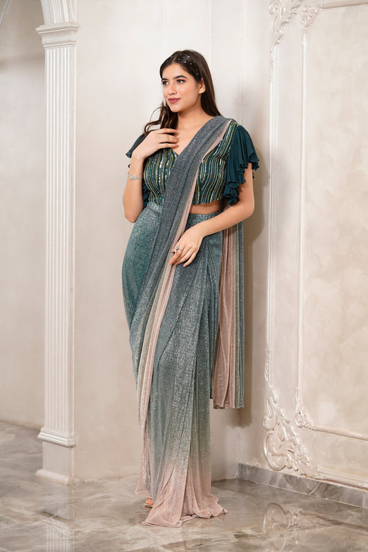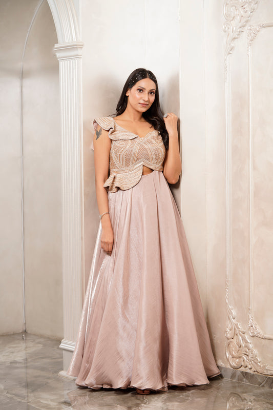 Allure gold glass organza lining shantoon bloom cape draped skirt set