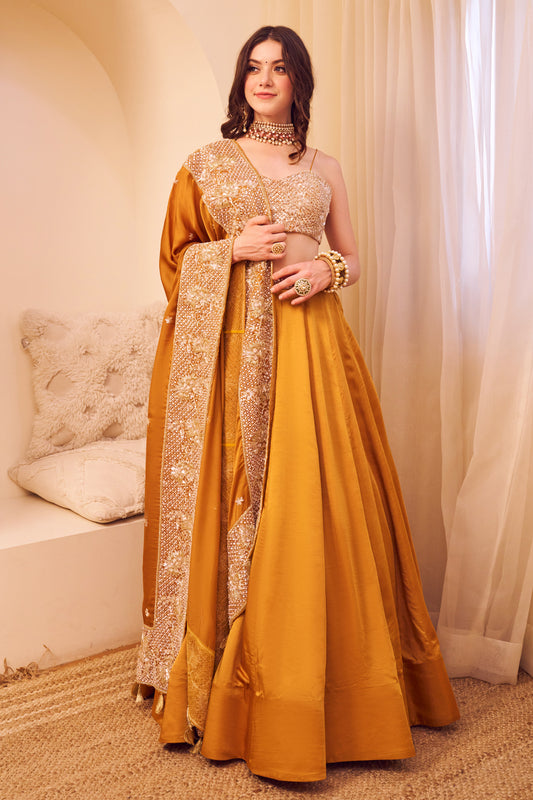 Aashiyaan mustard satin silk lining shantoon gul jaal waistband lehenga set