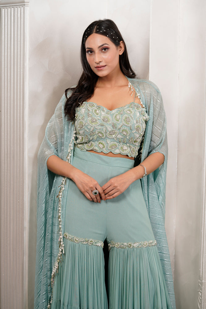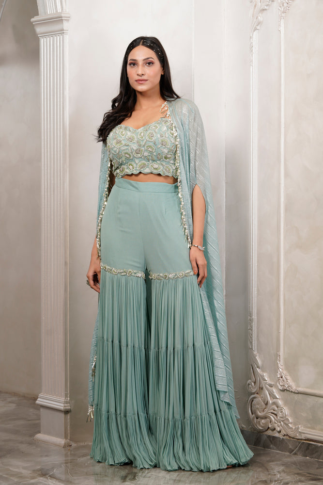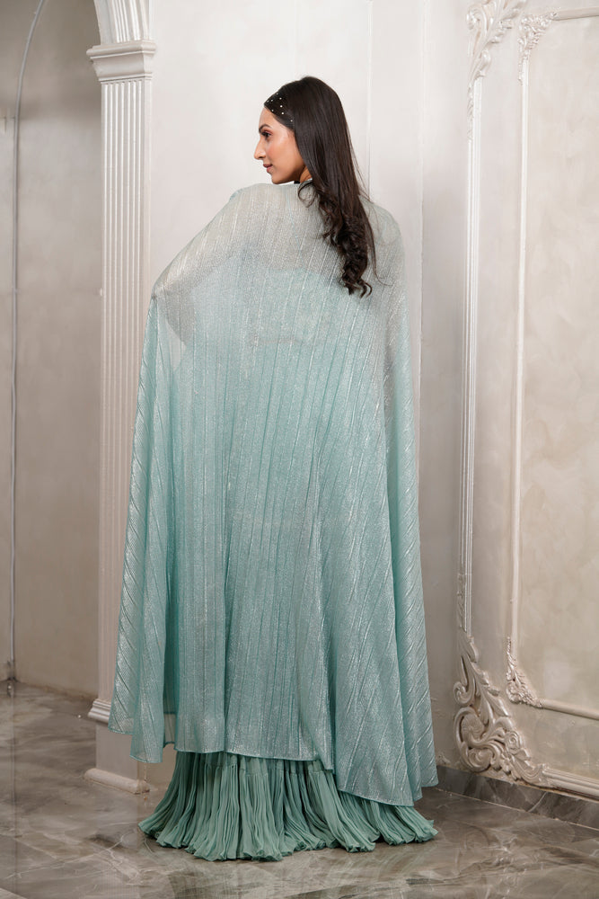 • You will receive a pleated fabric cape with a georgette bustier and sharara.