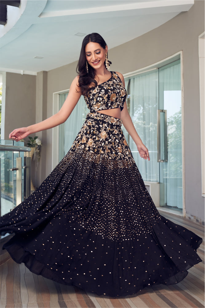 • Heavily Embroidered Lehenga • One Shoulder Blouse • Side Zip