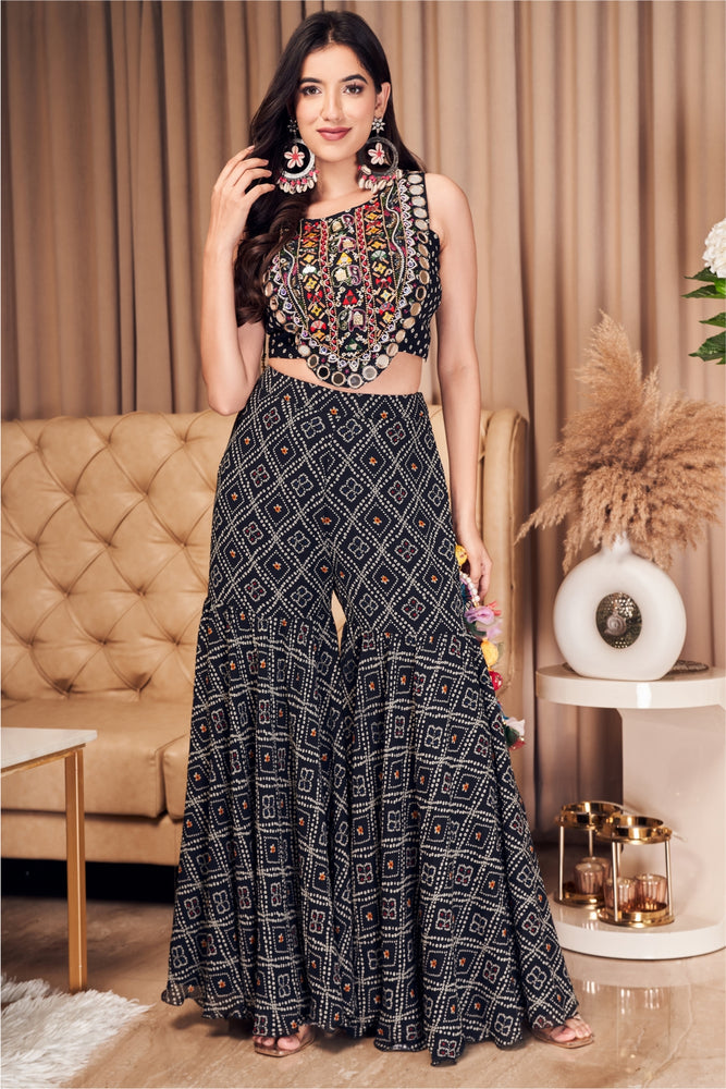 • You will receive a black printed geoegette blouse, sharara and a cape
