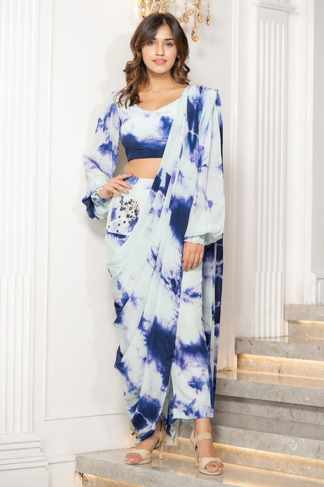 Blouse - Tye Dye Powder Blue & Navy Blue V -Neck Blouse With Deep Back & Full Ballon Sleeves With Smokking Details.