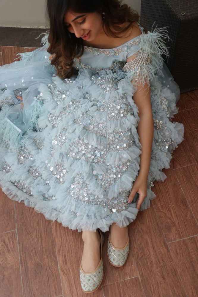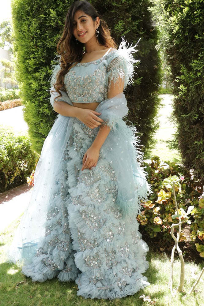 This couture lehenga is a set of 3 which features a micro pleated skirt, along with a sequince embellished blouse & feathers add to the elegance making it more trendy. Elements like fringes and feathers are used throughout which have a fresh & unique feel that showcases an amalgamation of the Indian culture.