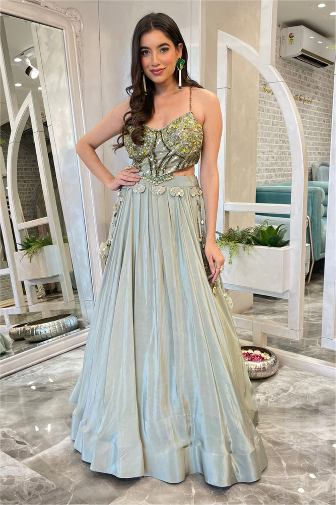 • You will receive a sleeveless corset blouse along a with a double bias crepe skirt..