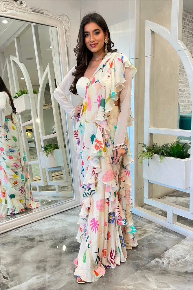 • It has beautiful tassle and back bow detailing. •It comes a ruffle ready to wear sari.