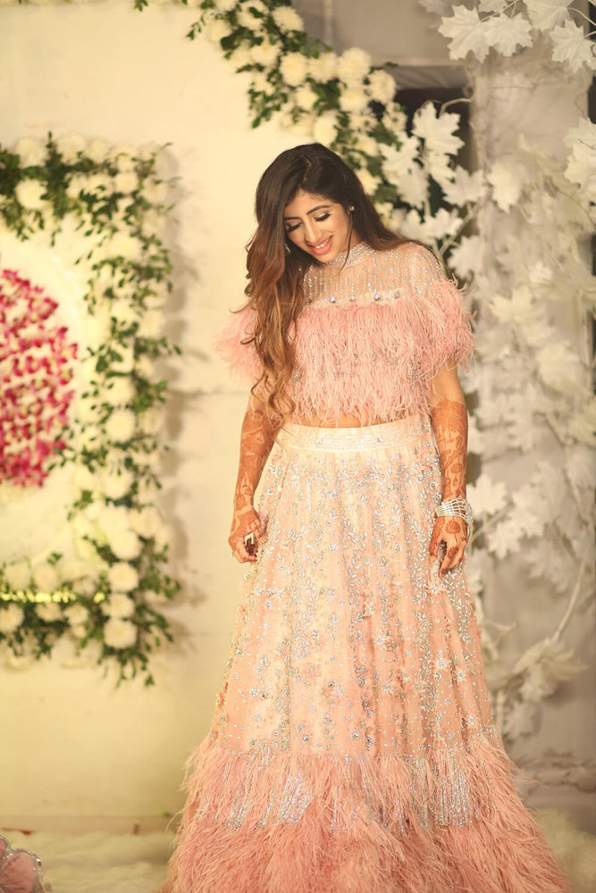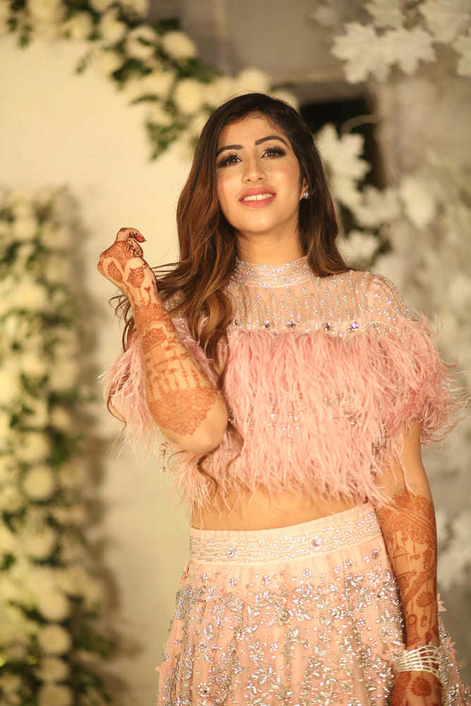 Featuring a light pink 2 piece set in tulle fabric with silver sequins and swarovski embroidery work. Feather edging lehenga and the blouse is the highlight and 3D flowers add to the look. Neckline work in pink swarovski.