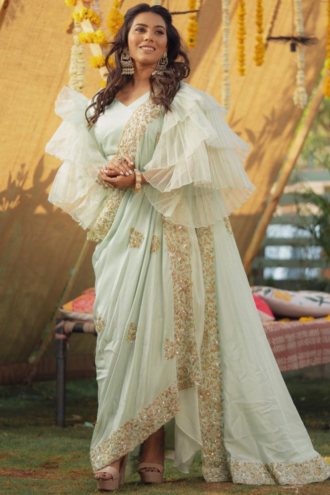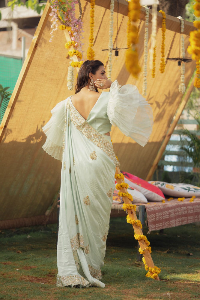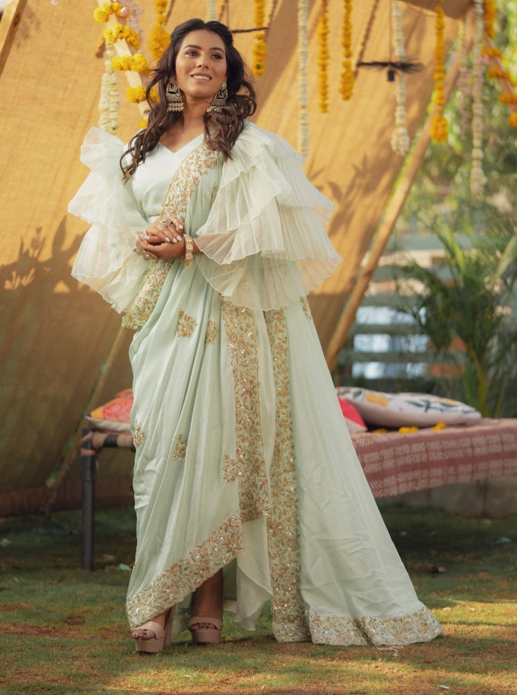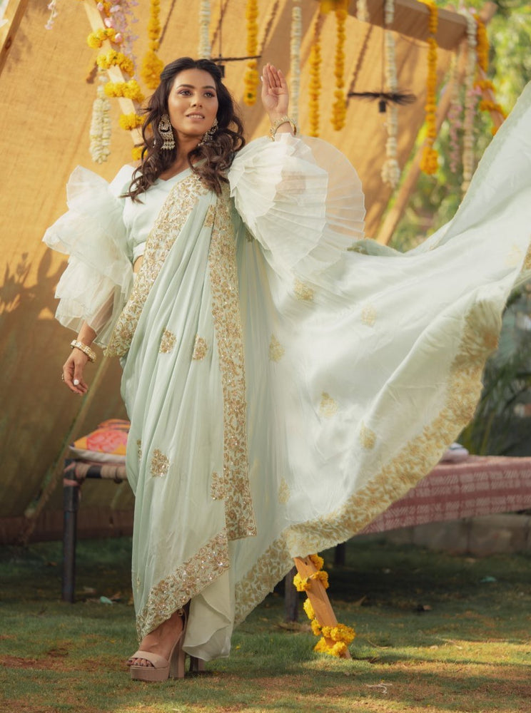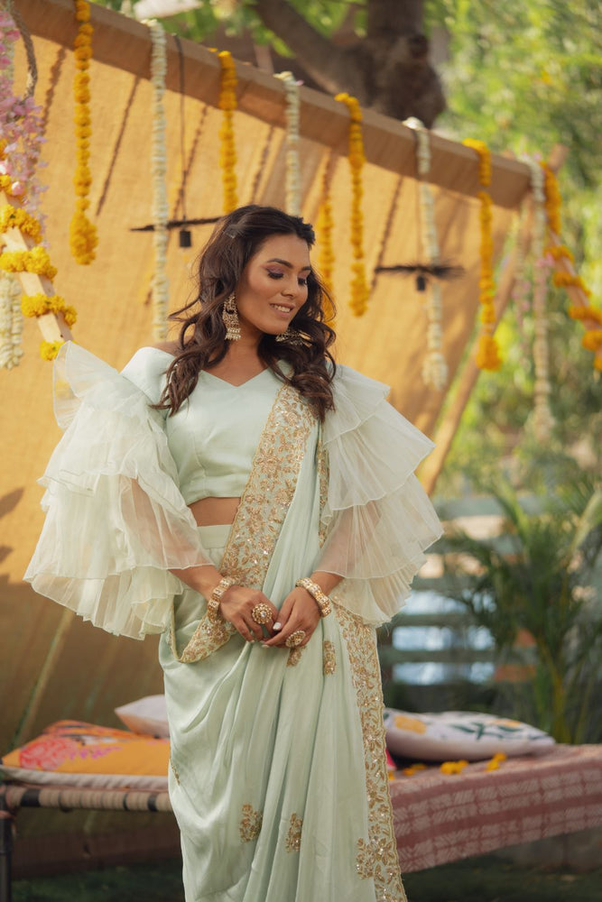 •Sold With Pre Set Drape Attached To Blouse With Heavy Golden Work Border