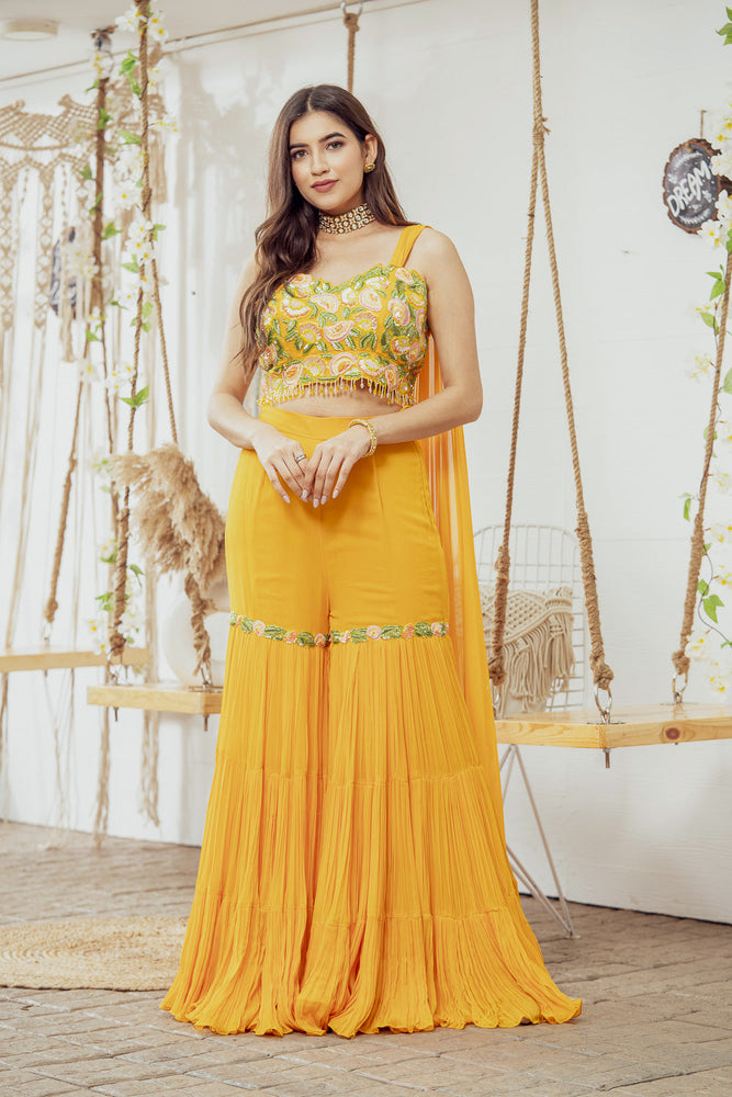 • You will receive a georgette draped co-ord set (blouse & Gharara pants)