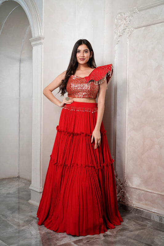 Rust orange ruffled layer skirt with an embellished blouse and dupatta