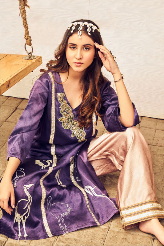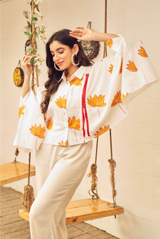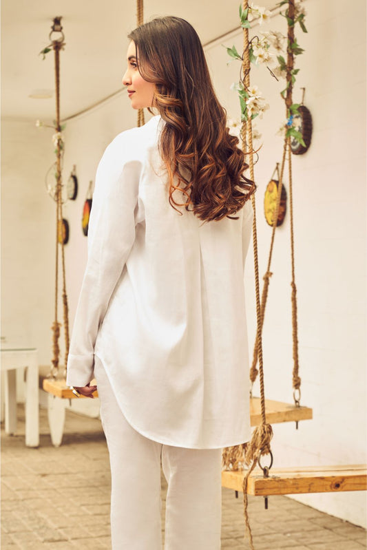 Boho white chanderi cotton embroidered shirt with assymetrical hem