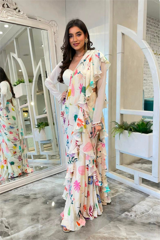 Edith ivory pearl embellished crepe and net saree set with corset blouse