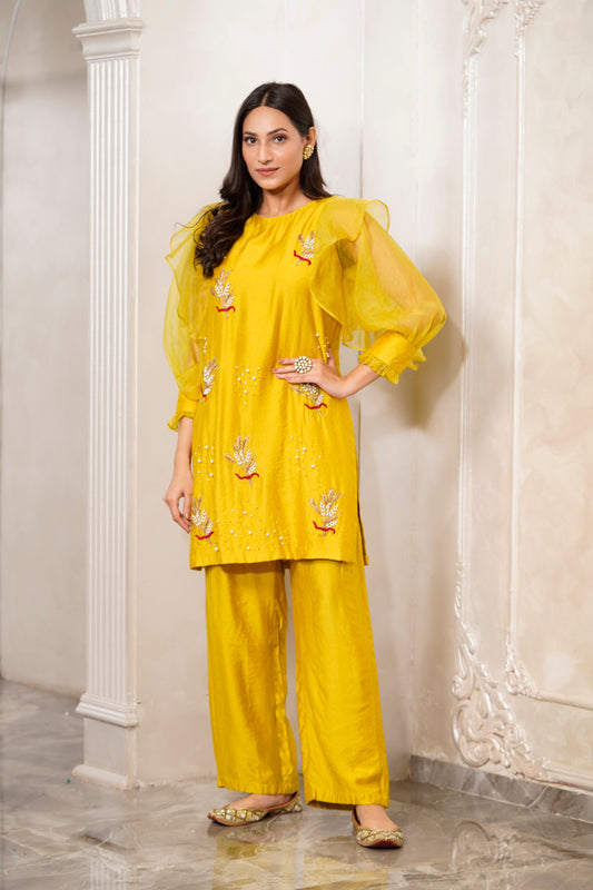 Floral bubble set pink organza embroidered and embellished lehenga set with blouse