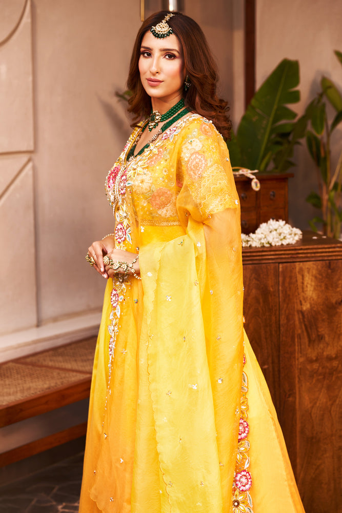 She graces the occasion in the outfit that blooms from yellow to orange, an ombré of sunrise hues. The sequins and beads create a tapestry of luxury. With stunning fabrics twirling around, she radiates sunshine aura, turning shringar into a vibrant celebration of art and tradition.