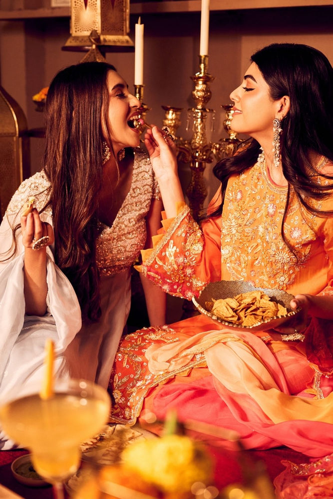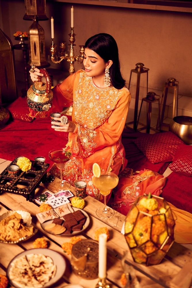 Combining the ease of contemporary style with festive allure in a vibrant hue of orange, this kurta set is your answer to all those Diwali party invites! The viscose organza falls beautifully the jewel neckline and full sleeves bring a regal feel to the outfit, making sure you wear it for the Diwali parties and beyond!