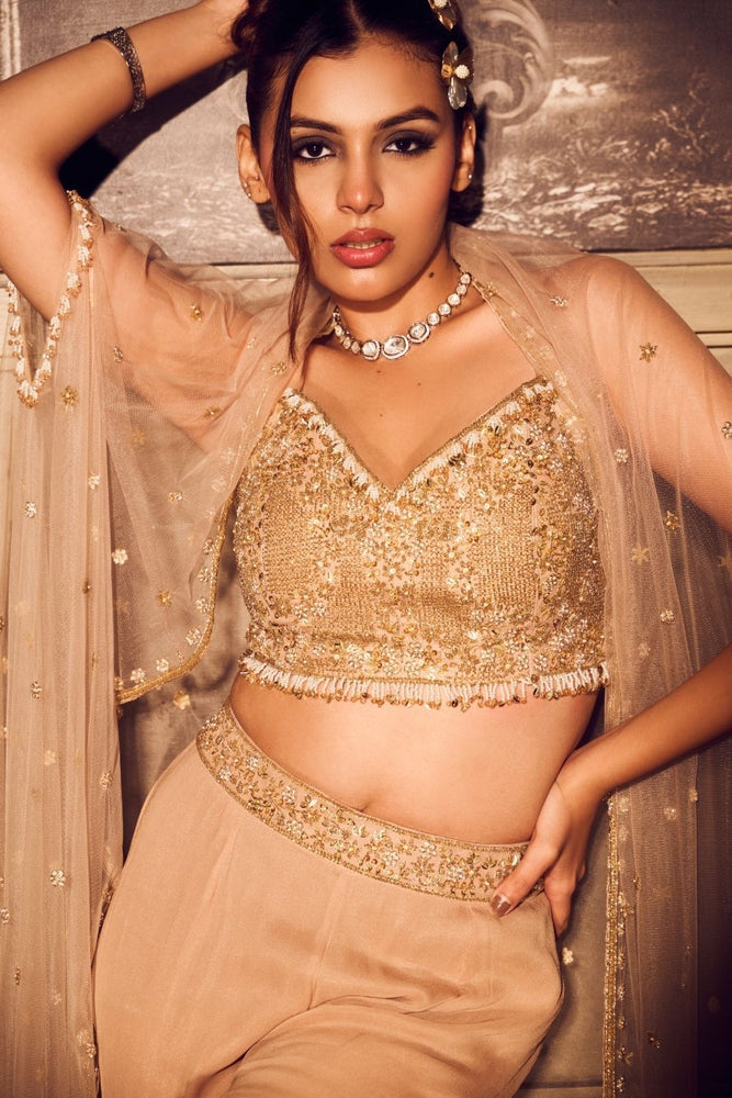 The siren-inspired collection would be incomplete without the tidal waves of a layered gharara moment! From a studded bustier that sparkles with every move to the gorgeous cape, this one's a must-have for the modern enchantress.