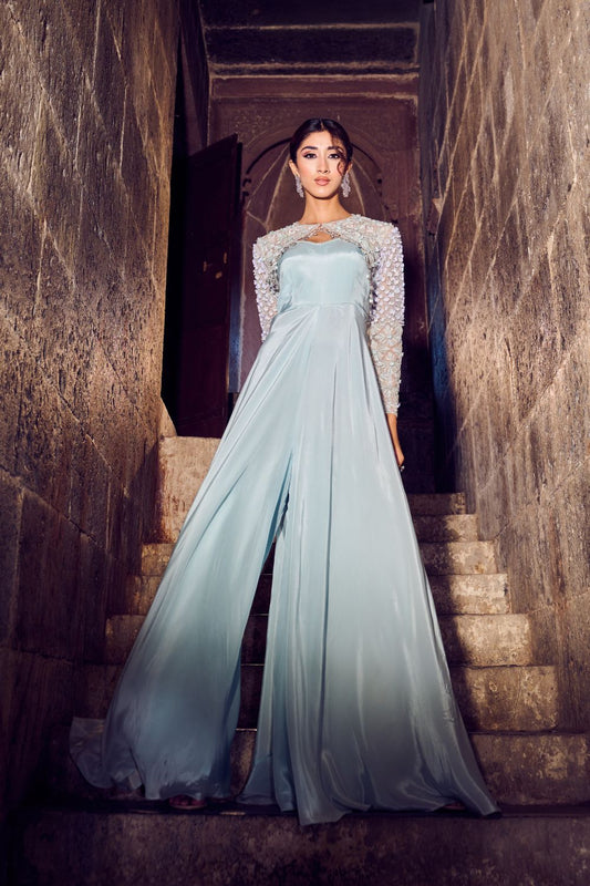 Glacielle powder blue embellished net, satin and organza lehenga with blouse and jacket