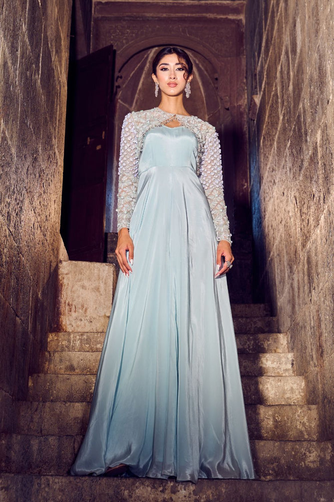 She steps into the ballroom, donning the powder blue gown, sculpted to perfection, with every sequin and diamond casting a quiet shimmer. The sweetheart neckline adds a touch of romance, while sheer full sleeves of the short cape balance delicacy with grandeur. This is what one needs for an intimate cocktail hour, as you’re ready to capture the spotlight.