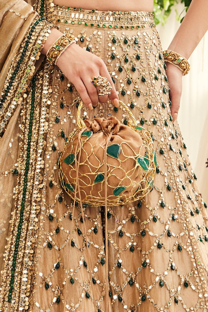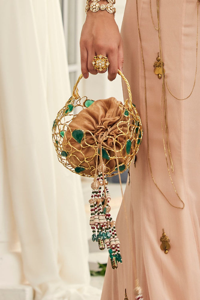 Crafted from a blend of a golden metal outer frame and tissue, this handbag is elevated with intricate jewel hand embroidery. Its radiant finish makes it the perfect piece to pair with wedding ensembles, adding a touch of opulence to every moment. A true keepsake, it shines as beautifully as the occasion itself.