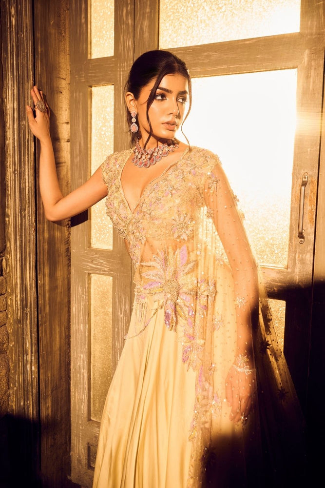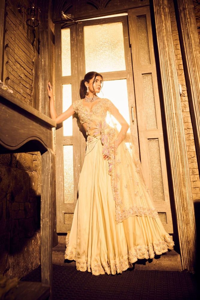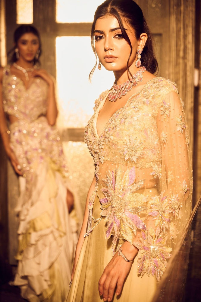 The perfect harmony of western chic and Indian soul, crafted for the ones who sparkle even after the party ends. A flowing green lehenga that sways with every beat, the embellished hem and belt add a touch of sparkle, while the backless cap-sleeve blouse brings just the right amount of boldness. With a detachable drape that offers a modern twist we’re all set for the night that doesn’t end!
