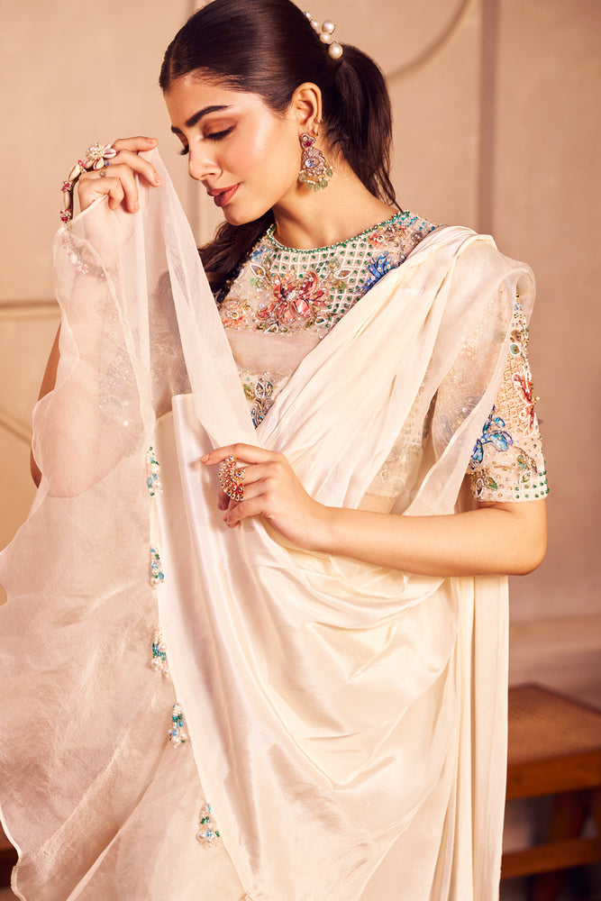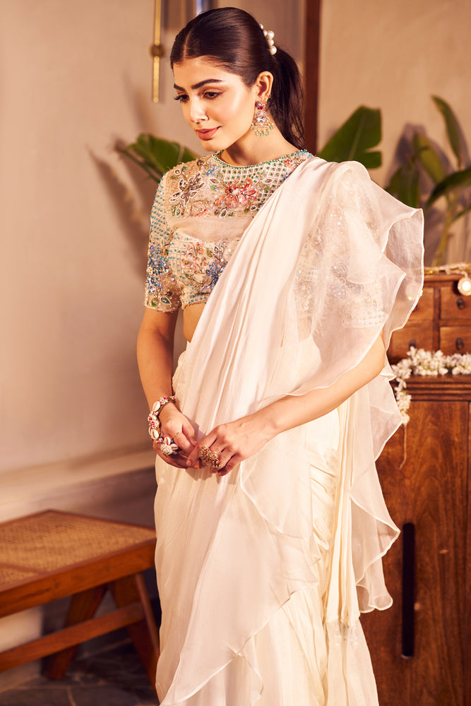 In an ivory drape ruffle saree, she embodies grace, the jewel-neck blouse with elbow sleeves adding a refined touch! The crepe and organza fabric flow beautifully, adorned with hand-painted details, and embellishments that shimmer subtly. A detail you can’t miss is the small tassels at the end of the pallu, that make for a refreshing addition!
