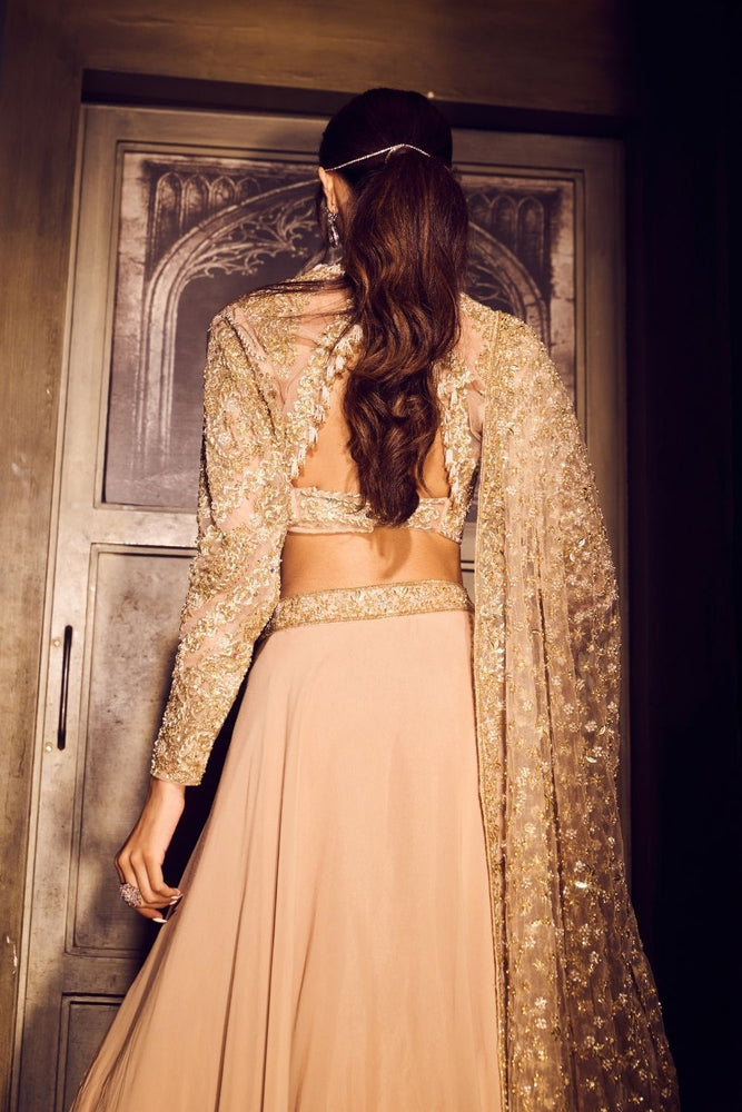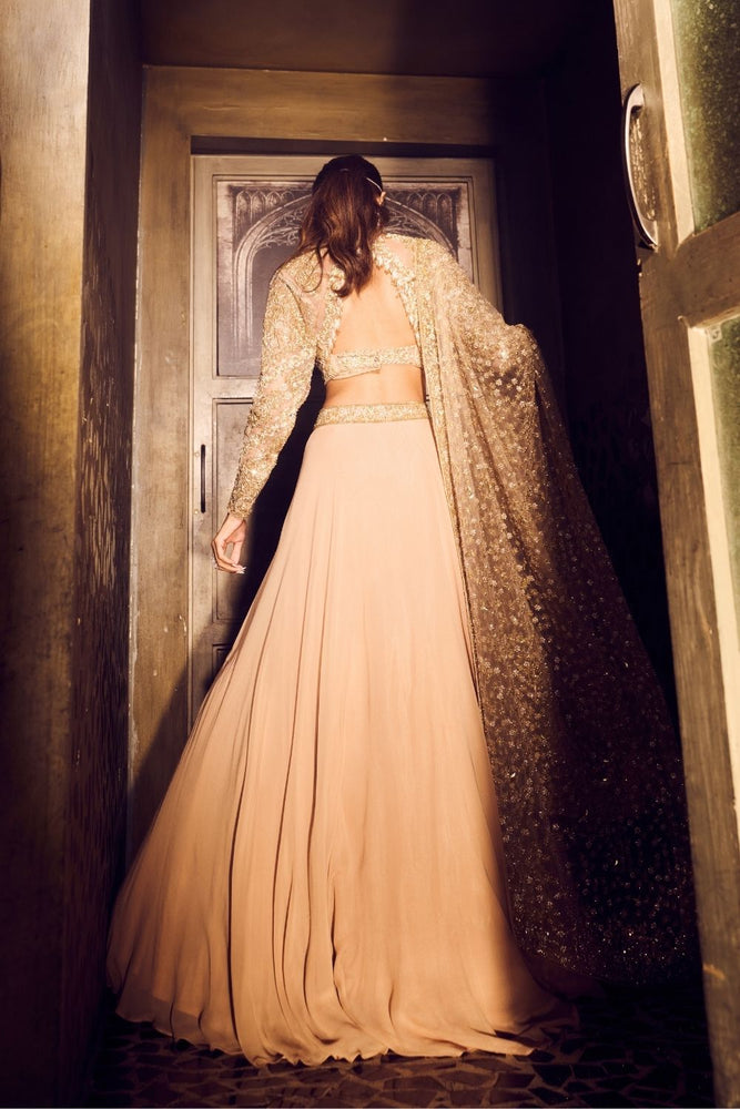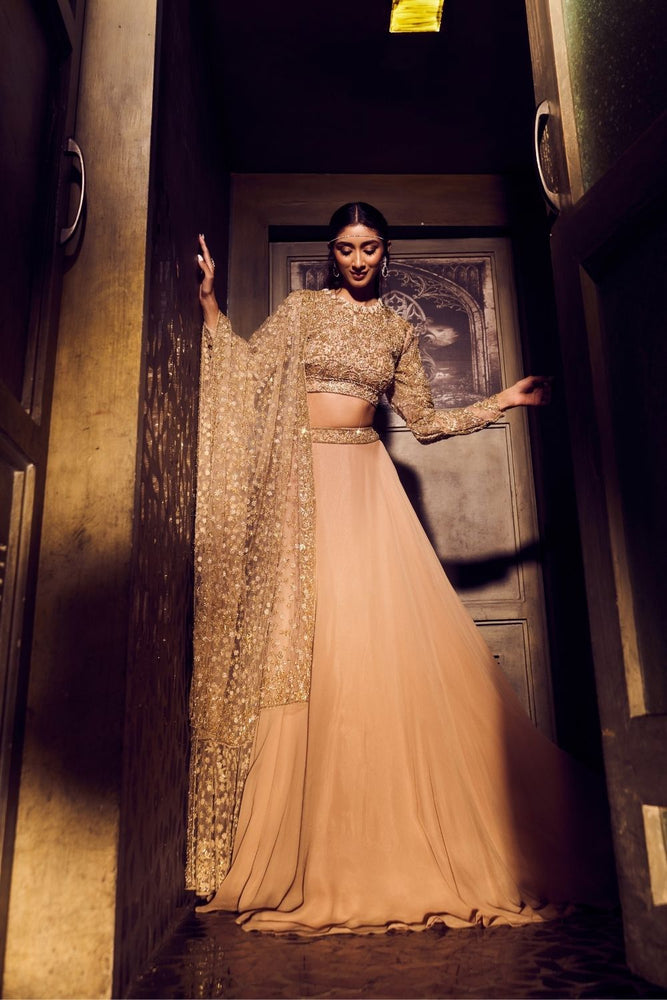 For the brides-to-be looking to shine this wedding season, here glides in a beautiful stunning lehenga set. Studded with shimmering flowers, style the gold dupatta like a fluid cape to match the flowing ghera!