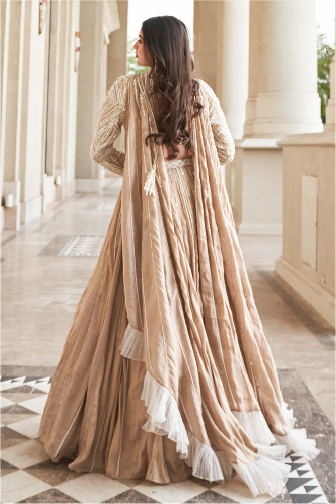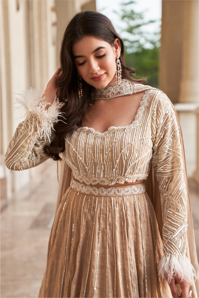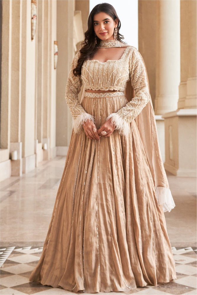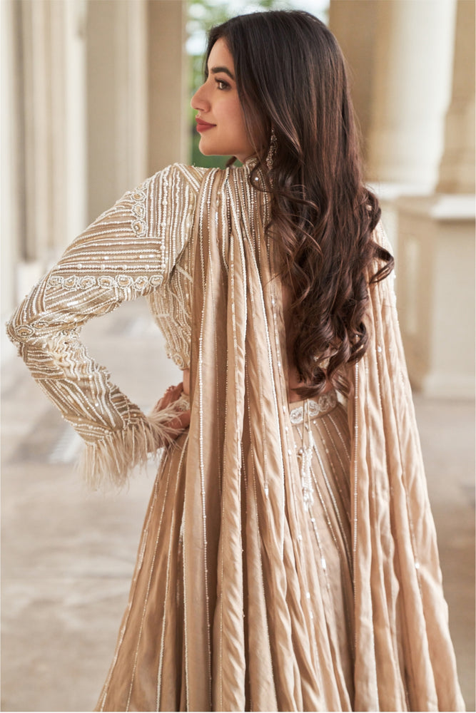 • It has beautiful embellishment on the blouse with feather detailing. • It has an embellished kali skirt with embellished dupatta .
