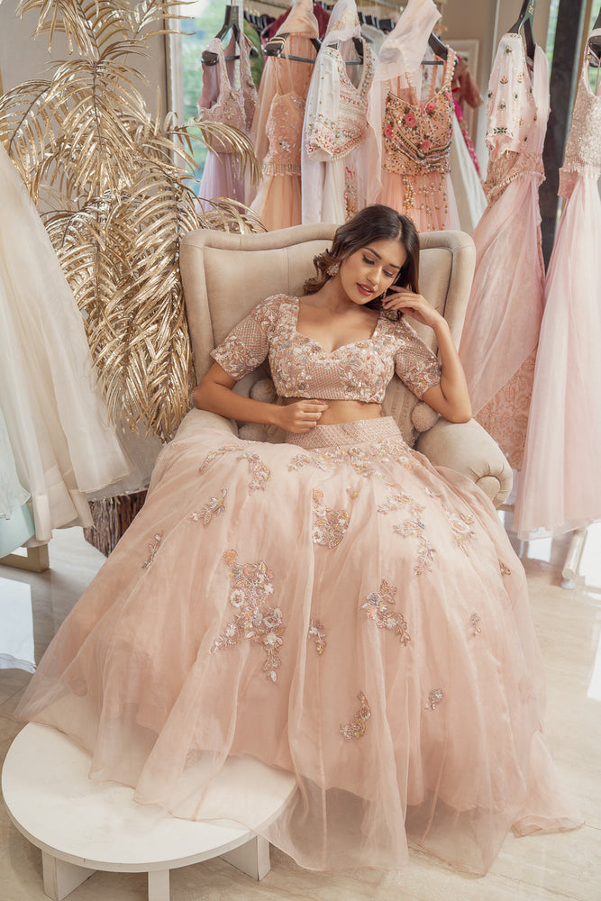 •Mauve Organza Kali Lehenga With Elbow Sleeve Blouse