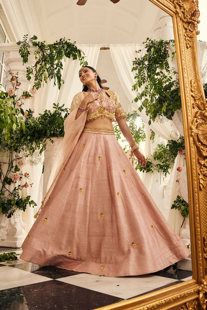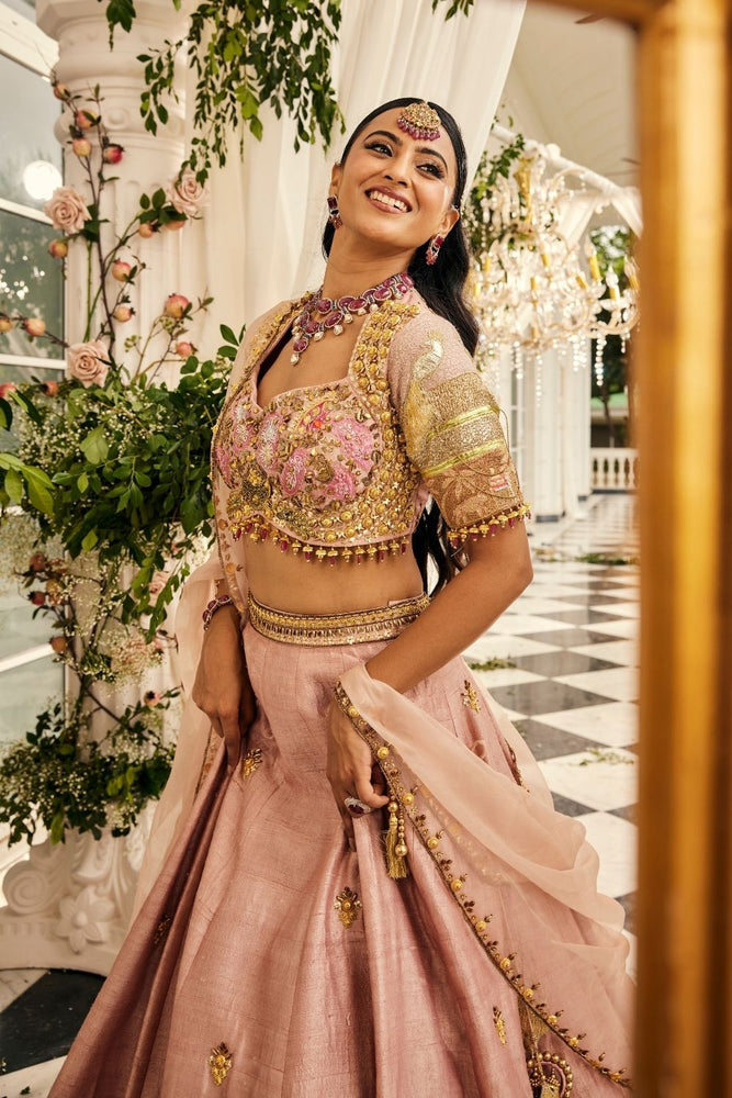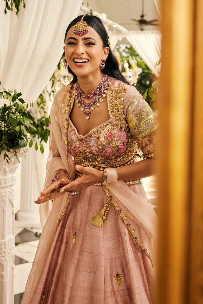 Blush pink is the color of unspoken promises, and this lehenga feels like a gentle vow come alive. Crafted in raw silk and organza, it carries the lightness of a dream, yet glows with hand-embellished scarlet and emerald details that mark every stitch with celebration. The sweetheart neckline and graceful sleeves lend a timeless charm, while the lehenga flows like a tender melody around the bride. It is a moment of softness and strength entwined - made for the bride who wishes her joy to bloom in shades of love.
