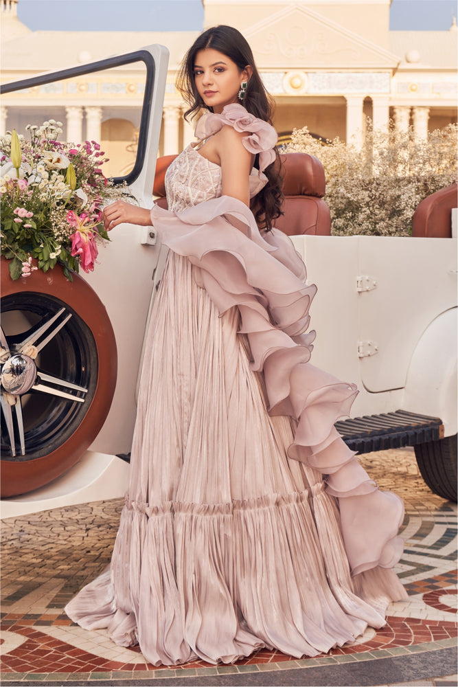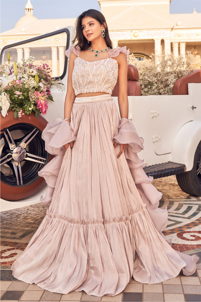 • It has beautiful embellishment on the blouse with ruffle detailing. • It has a layered and gathered skirt with a ruffle dupatta .
