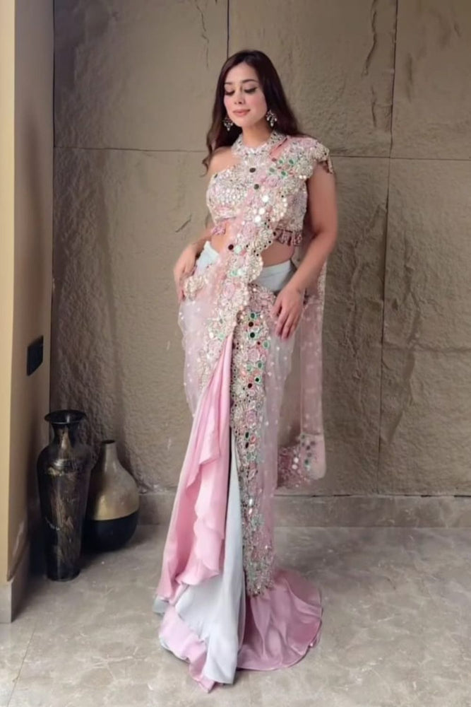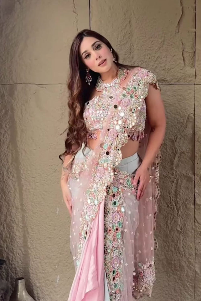 In a delicate harmony of rose gold and powder blue, this pre-draped saree redefines elegance for our bridesmaid. Crafted from soft satin organza, each fold glimmers with intricate mirror work, paired with a sleeveless halter blouse, that offers a sophisticated yet effortless look, ideal for reception nights or sangeet celebrations.
