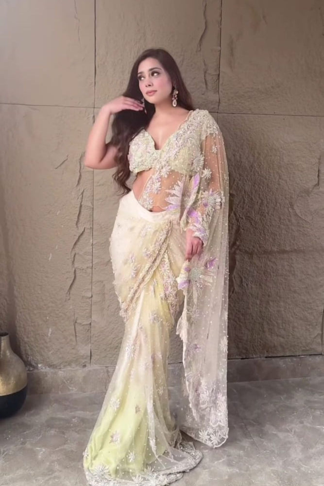 Under the soft glow of a starlit, she is ready for the evening in a pre-draped saree that feels as effortless as it is enchanting. The delicate mint and off-white net fabric shimmers with cutdana, sequins, and nakshi work, creating a sparkle that rivals the night sky. The deep leaf-neck blouse with short sleeves adds a modern charm, blending tradition with contemporary grace. Perfect for a cocktail night or a serene engagement ceremony, this ensemble turns every moment into a picture perfect one.