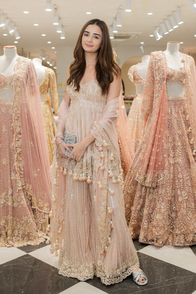 In the soft glow of a sun-kissed evening, she enters the celebration, a vision in her Blush Pink Peplum and Sharara Set. The peplum top, with its sweetheart neckline and delicate cape sleeves, drapes effortlessly over her and the sharara moves like a dream, its voluminous silhouette creating a picture of elegance. Paired with a flowing net dupatta, the ensemble blends contemporary flair with timeless charm—perfect for a sangeet or even wedding.
