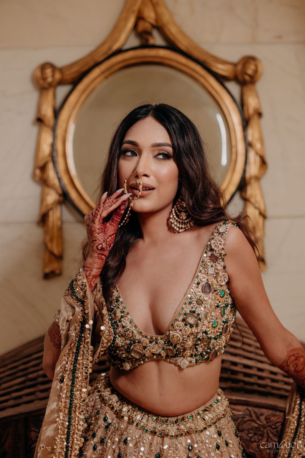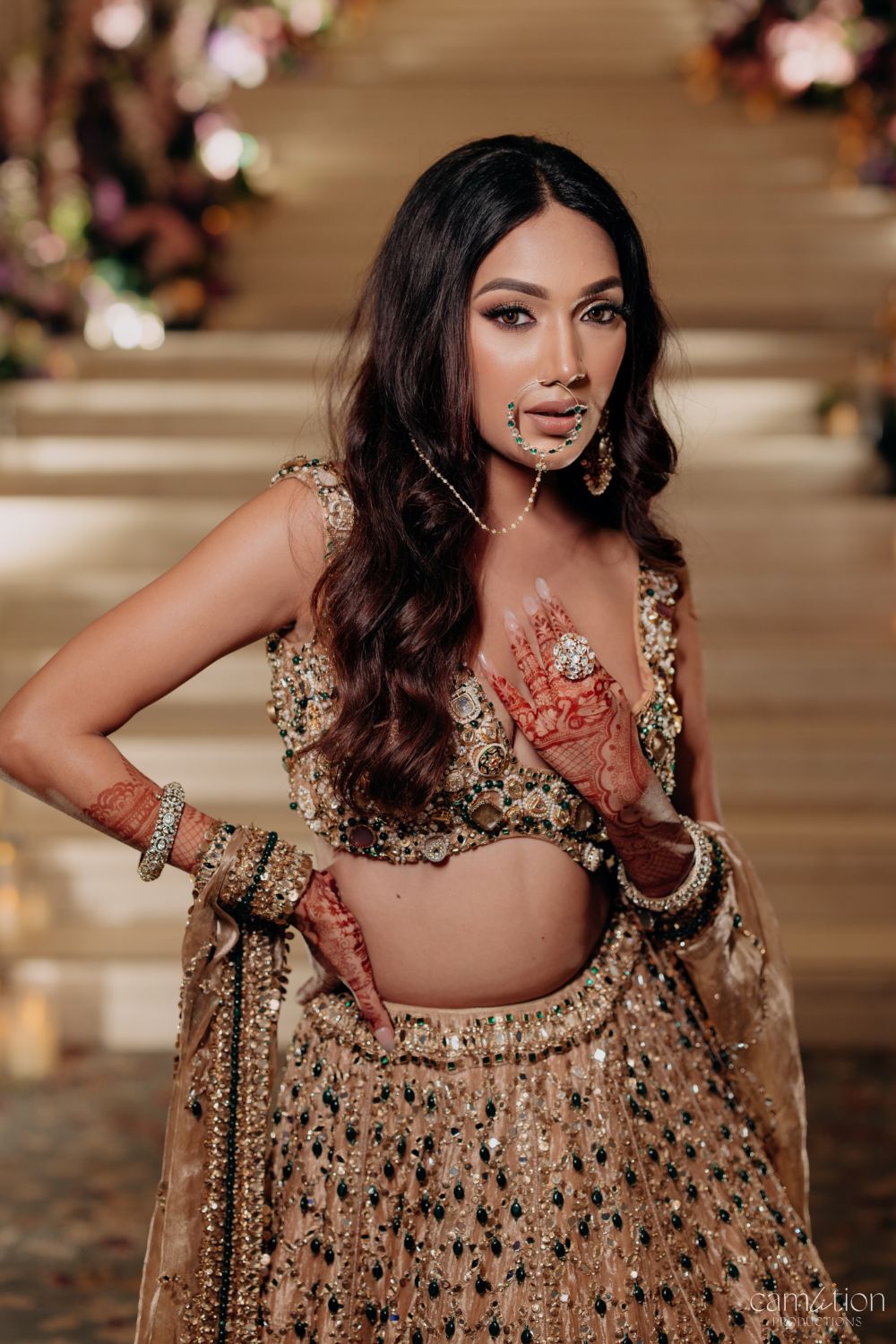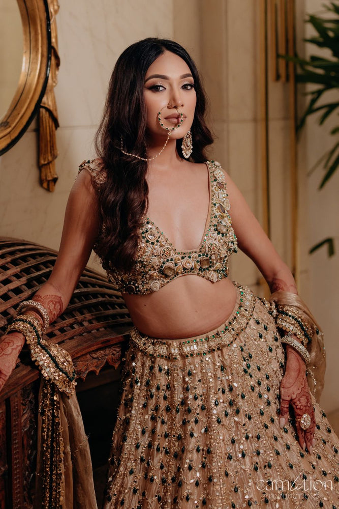 There are lehengas that dazzle, and then there are those that glow like they’ve been touched by light itself. This bridal chapter is woven in shimmering gold tissue, every fold alive with hand-embellished scarlet and emerald jewels. The glass neckline rests delicately, as though carved from crystal, framing the bride in a halo of brilliance. It is not just an ensemble, but a keepsake of radiance - made for the moment she becomes the center of every gaze, the heart of every story, the bride who carries gold like it was written for her.