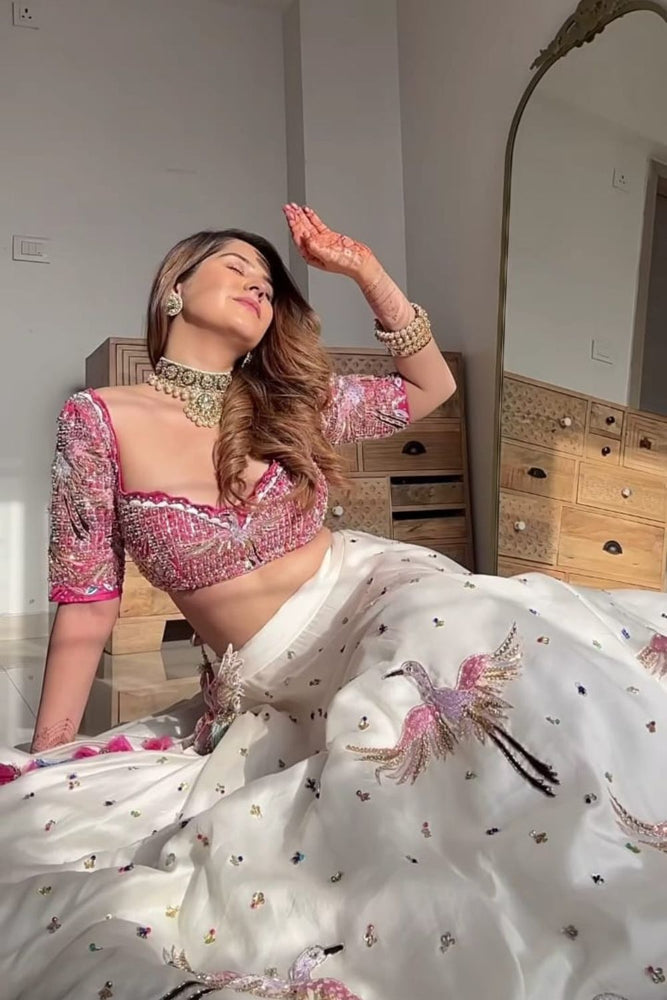 Beneath the soft arches of the courtyard, she embodies grace in an ivory and pink lehenga set that whispers elegance. The Chanderi and kora fabrics shimmer with intricate work, catching the light with every movement. The sweetheart-neck blouse with elbow-length sleeves balances the classic look with a modern touch, while the ethereal dupatta drapes like a soft dream