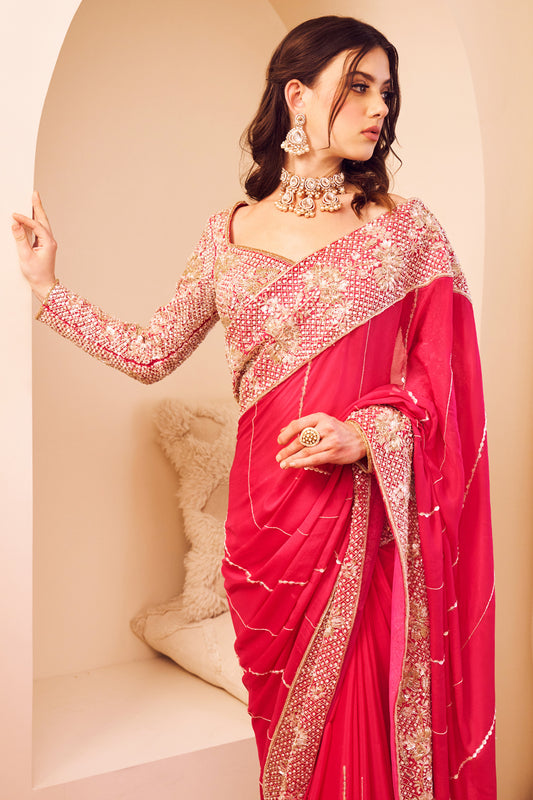 Masakali hot pink satin silk lining shantoon bloom blouse with draped skirt