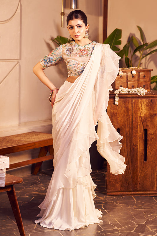 Meera ivory crepe embellished sequin solid pre-draped ruffle saree with blouse