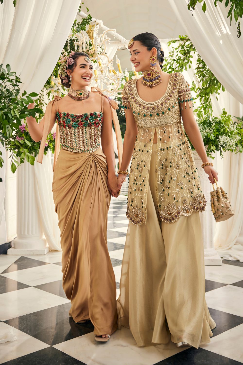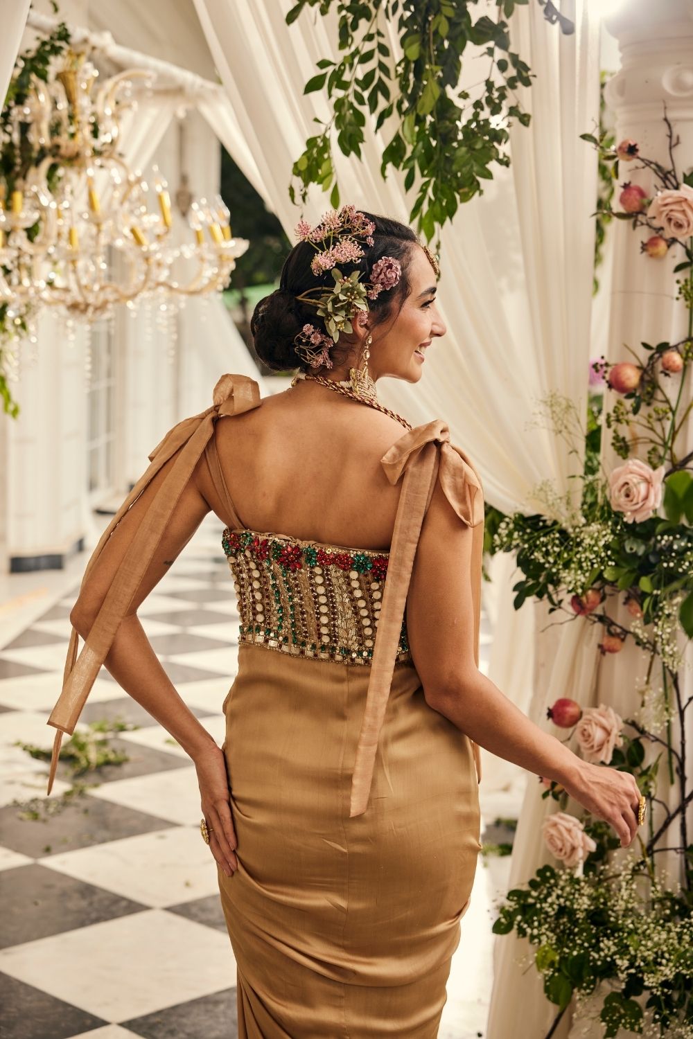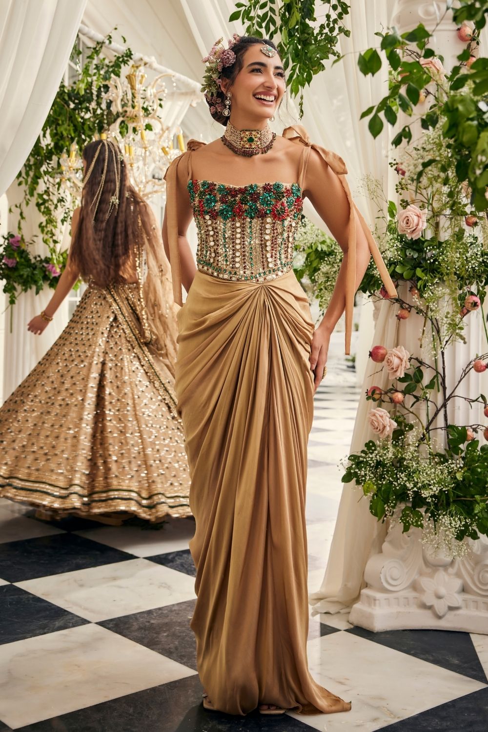 Some chapters in a bride’s journey feel like a dream spun in gold, and this drape gown is one of them. Sculpted in tissue, it gleams with jewel embellishments in scarlet and emerald, each hand-placed to catch the light like fragments of fire. The corset bodice with tie-up shoulders frames her with youthful charm, while the draped silhouette flows in effortless grace. It is a gown made for the bride who moves between tradition and modernity with ease, carrying both in her stride. A chapter written in pure gold.