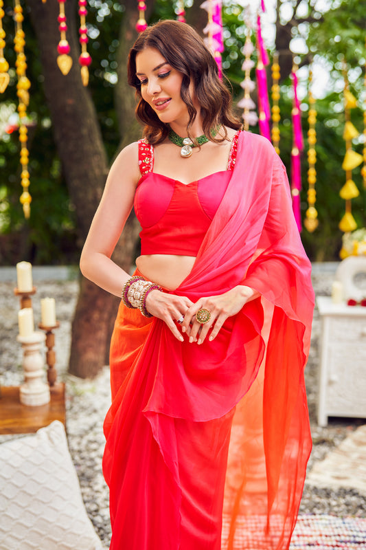Blushing ombre red viscose organza corset blouse with pre-draped saree