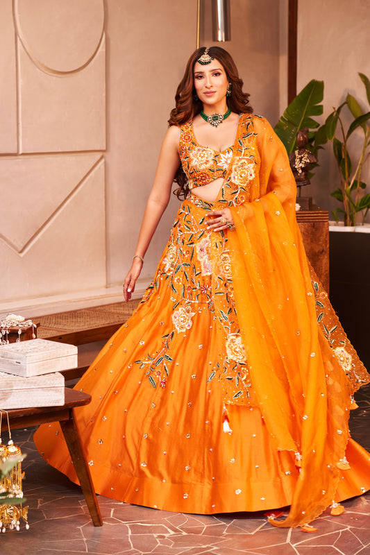 Shabnam orange kora organza embellished & embroidered kalidar lehenga set