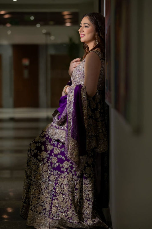 Rooh purple organza lining shantoon embroidery gul peplum kurti with sharara