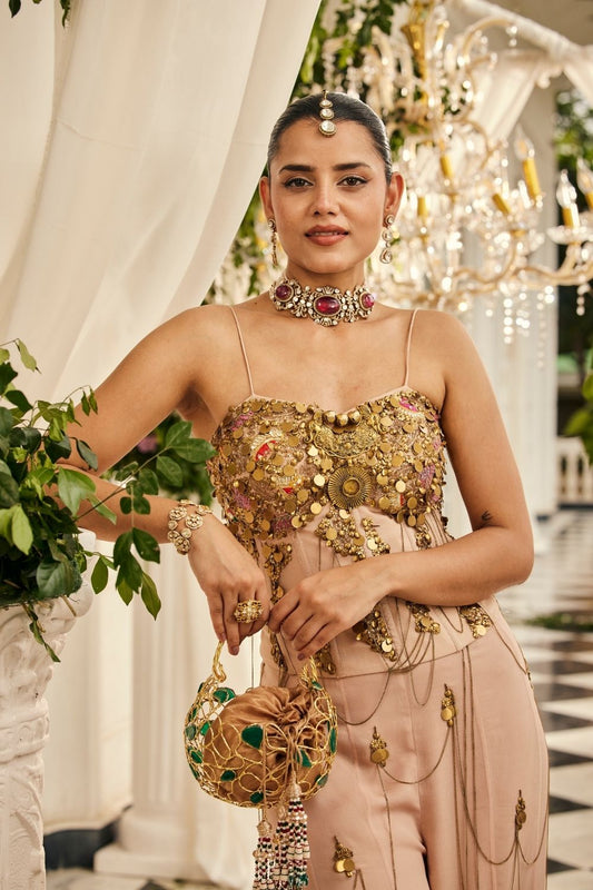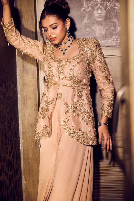 Ruhani rose gold mirrorwork draped skirt with kaftan