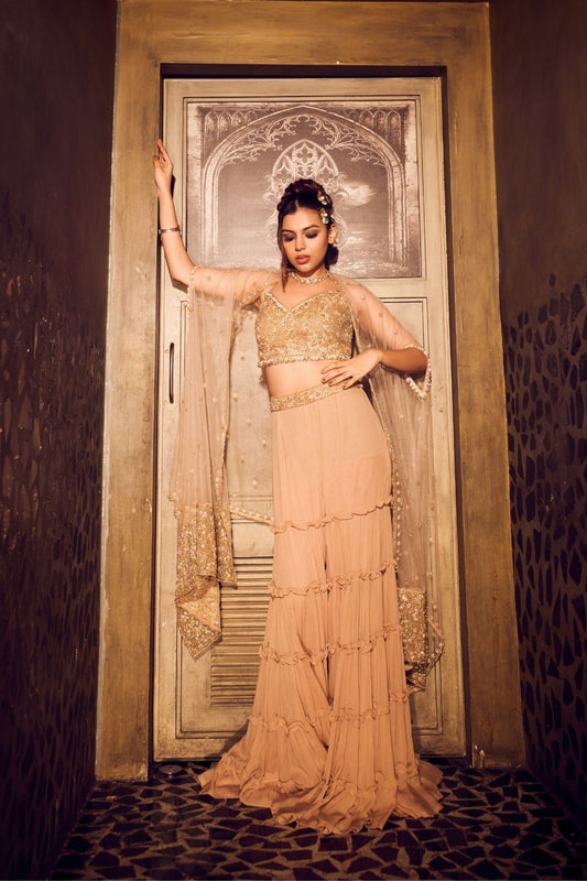 Lavanya rose gold mirrorwork skirt with bustier and cape