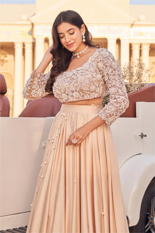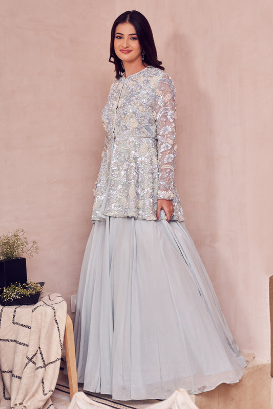 Gossamer sky blue crepe hand embellished pearls closed peplum kurta with lehenga