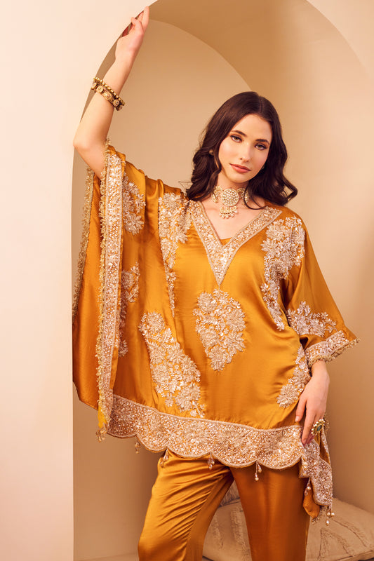 Seher yellow satin silk lining shantoon embroidery gullista kaftan with pant