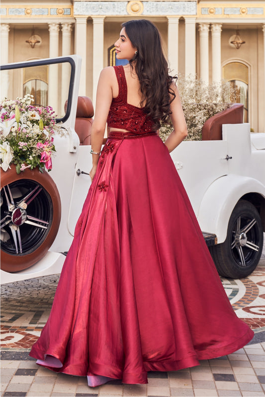 Chaand maroon satin silk lining shantoon padma jacket draped dhoti skirt set