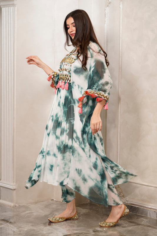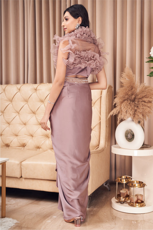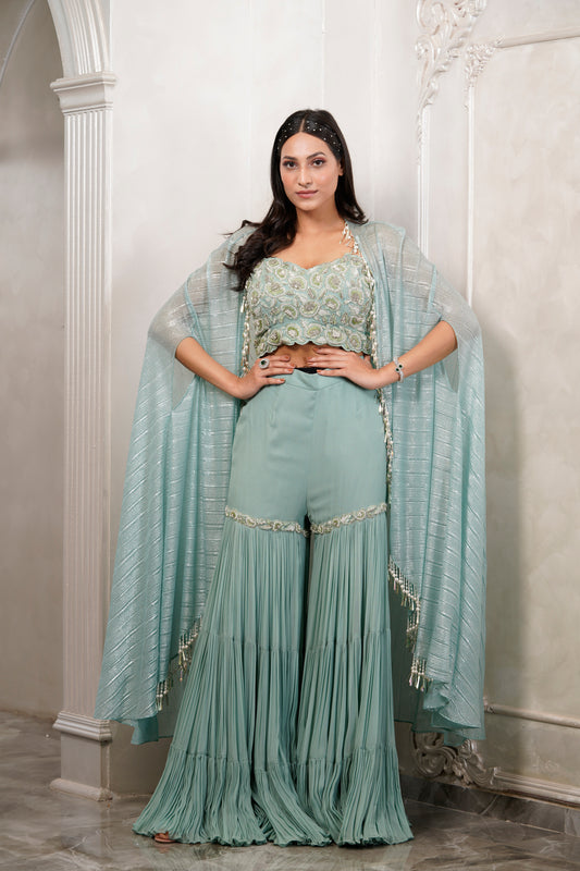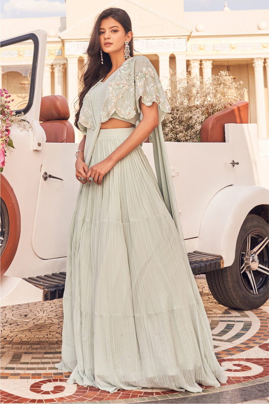 Synthia georgette bustier and skirt with drape and embellished cape.
