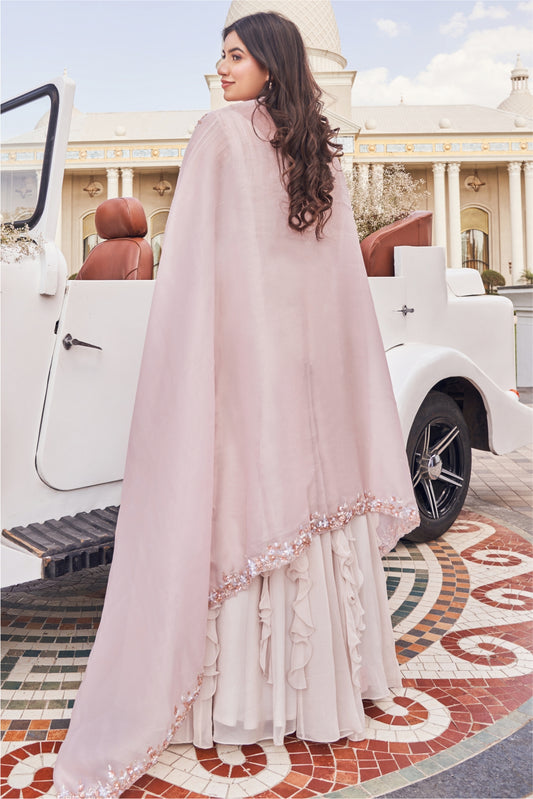 Rihanna embellished georgette blouse with skirt and paper organza dupatta.
